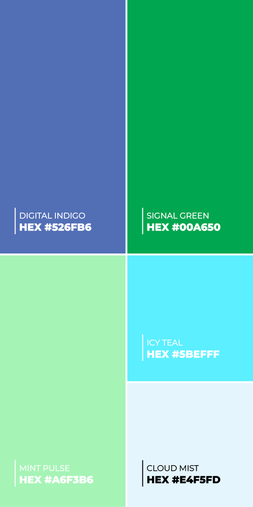 - Logo & Wordmark: Built from a minimalist, line-based type style that uses sharp angles and intentional gaps to reflect structure, motion, and digital precision.
